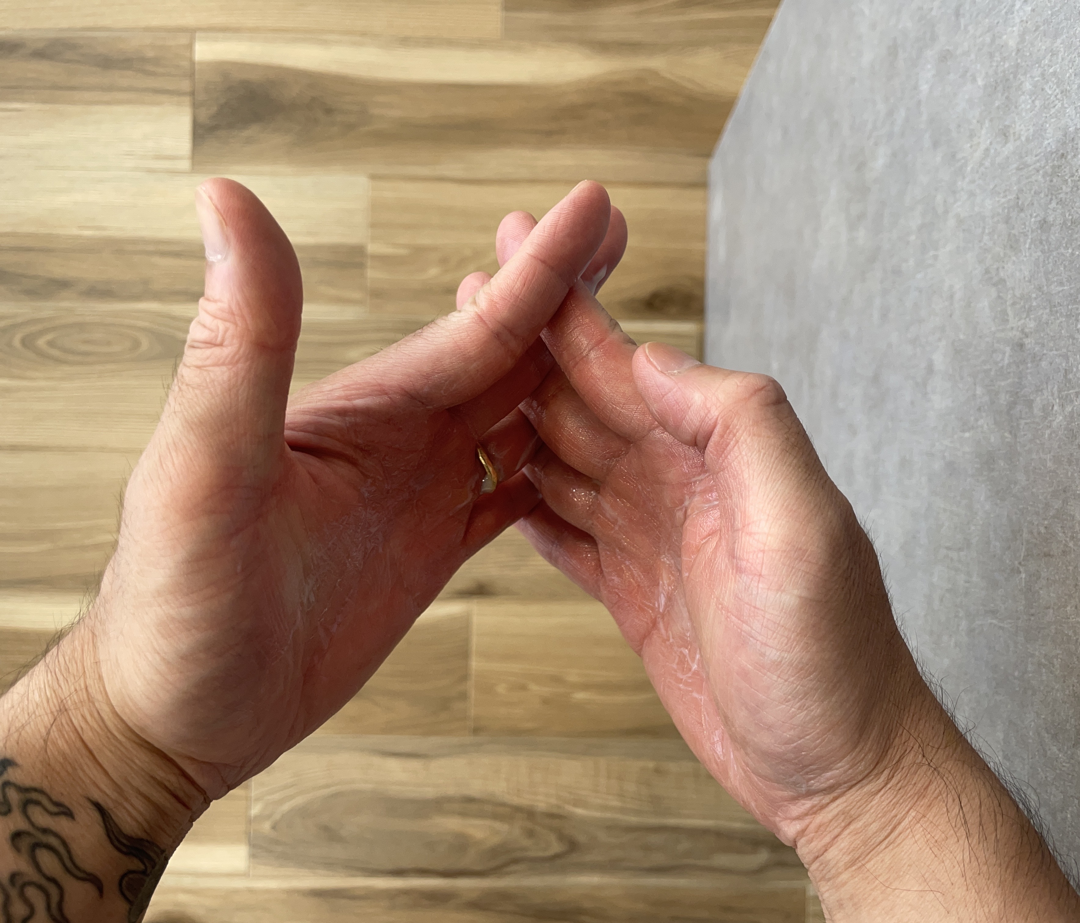 「手の全体、指と指の間にも広げる!」