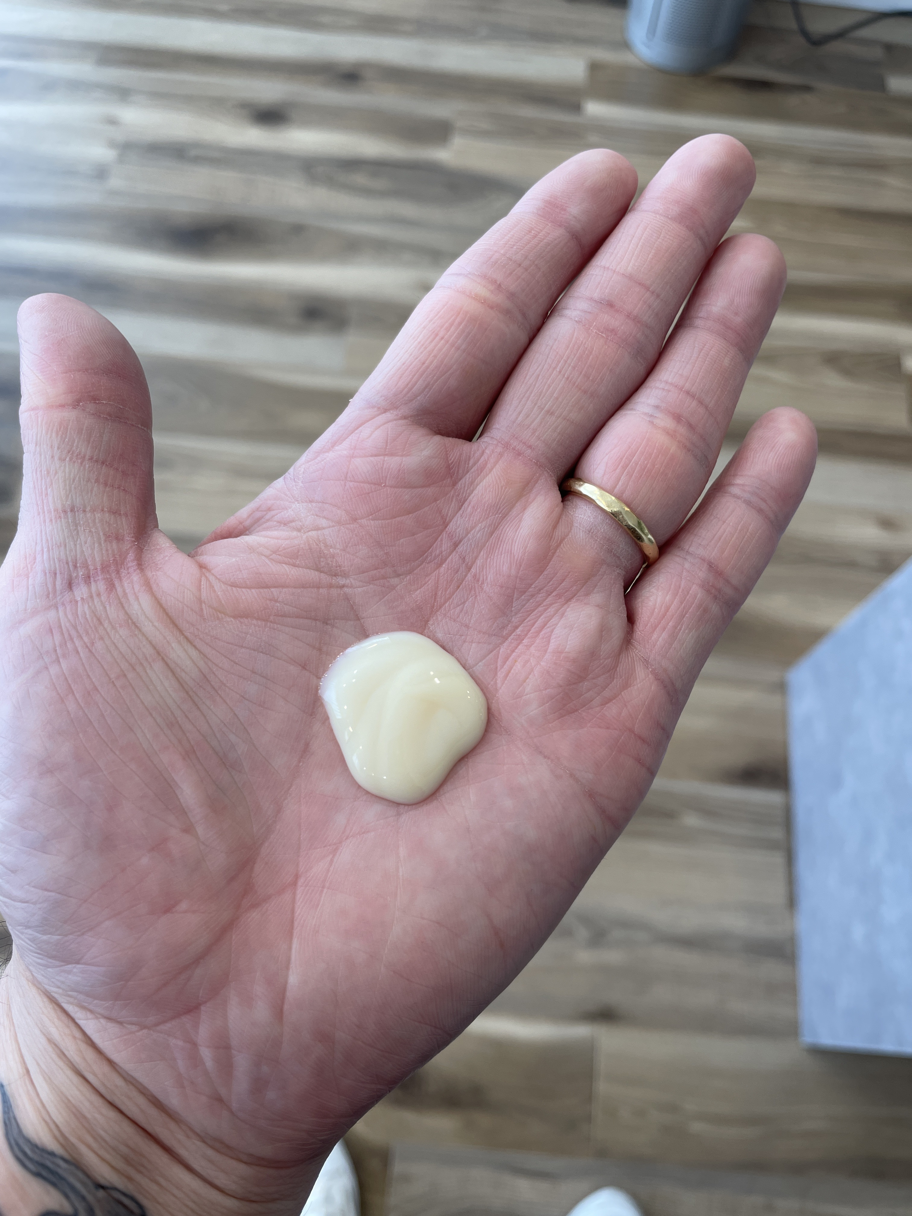 「まずスタイリング剤を10円くらいの量を手のひらに取りましょう!」