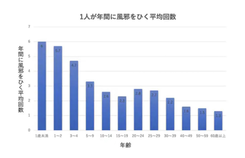 グラフでは、年齢別で年間平均どれくらいの回数かぜを引くかを示しています。