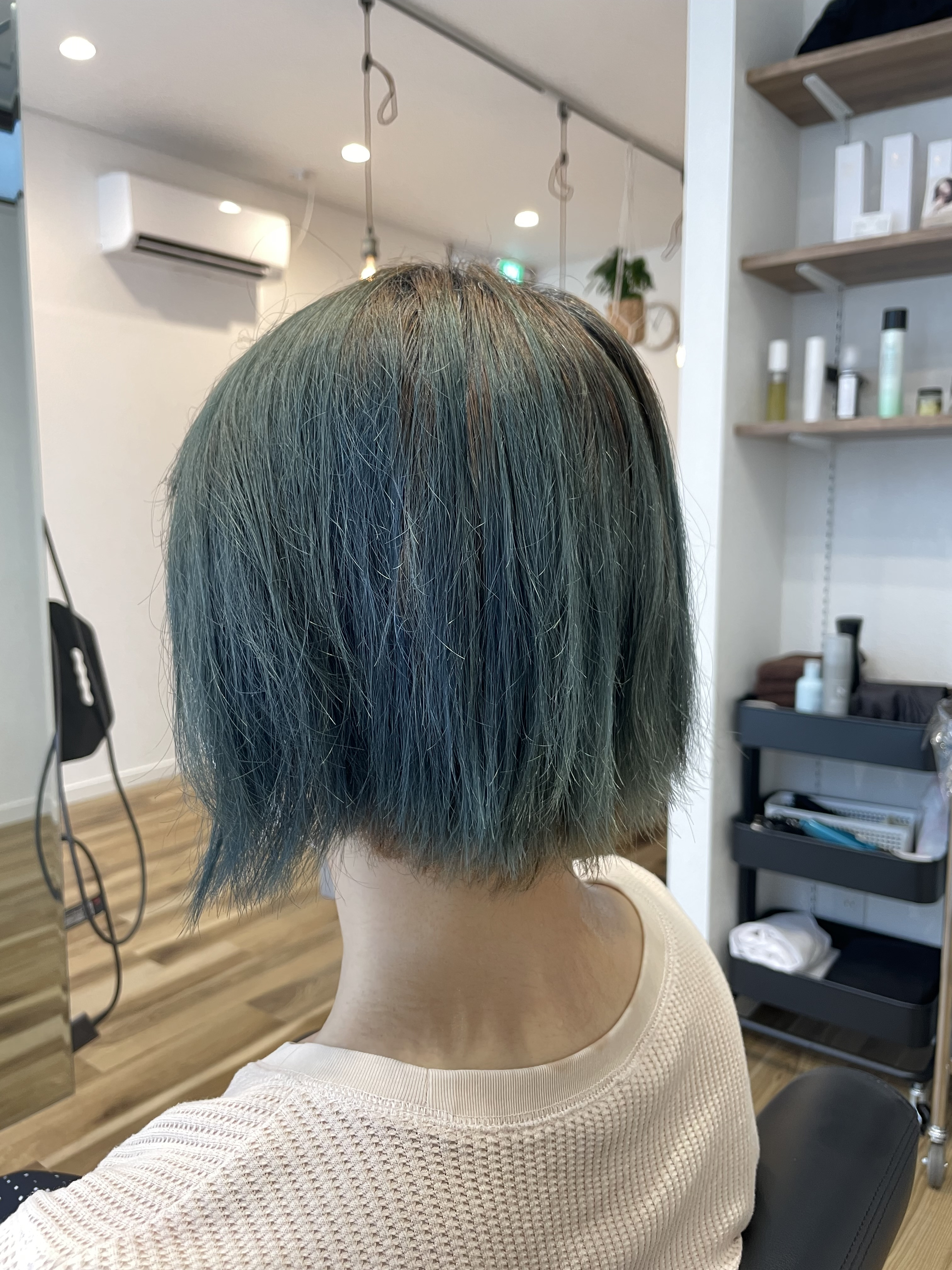 ヘアカラーは、根本は白いところが気になるので白髪染めのカラーを使い、毛先は前回のブルー系を少し消したいので暖色系ブラウンにします。
