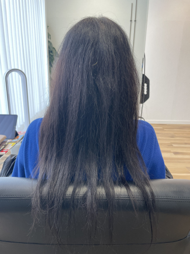 今年の2月に縮毛矯正後、ご自身で何回か根元のカラーをされていました。次第に毛先の引っ掛かりが気になって来たようです!