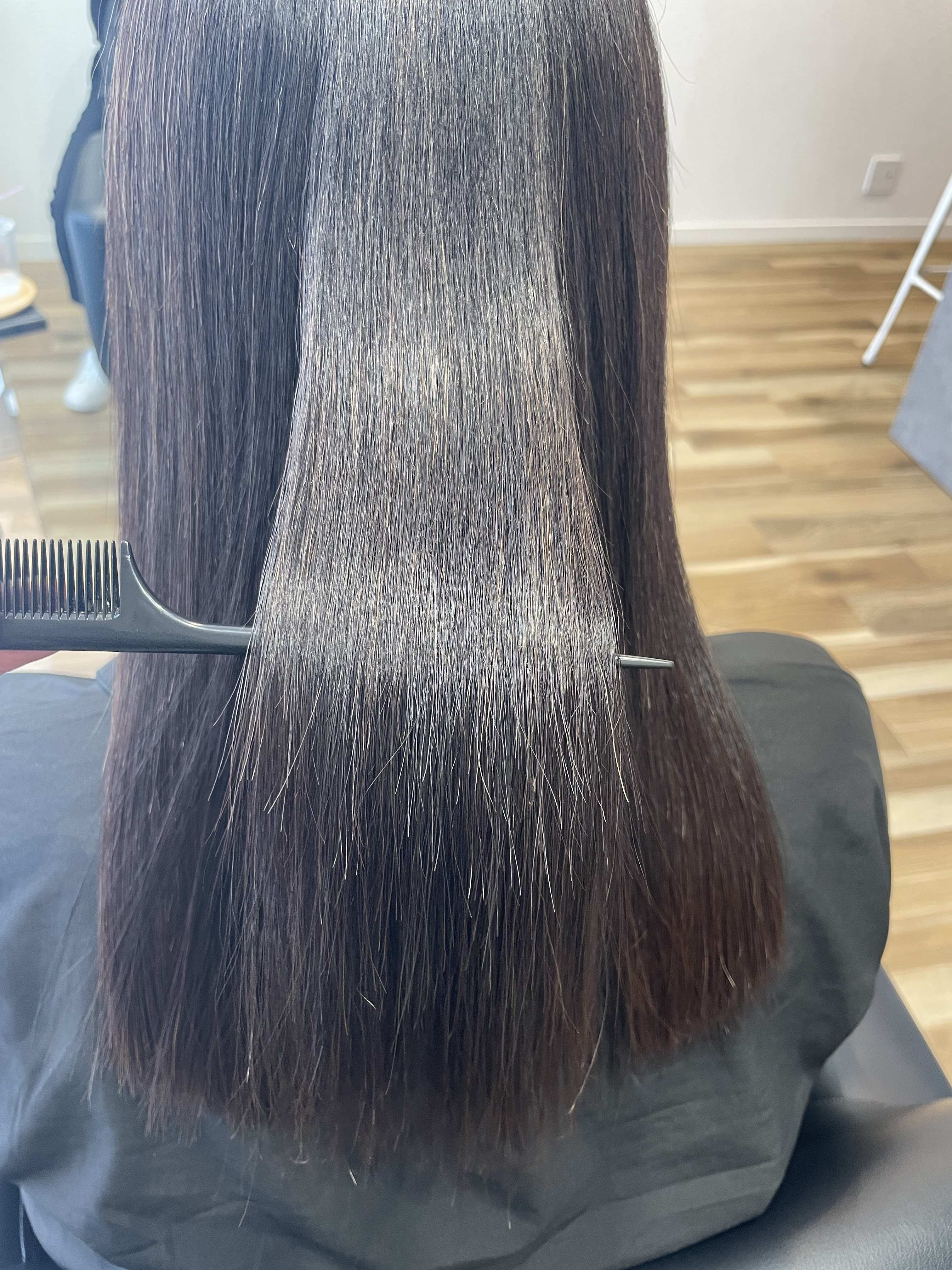 毛先はすでに何回か縮毛矯正をかけていますので、少し癖戻りが見られます。根本よりダメージを抱えているので慎重に施術していきます!