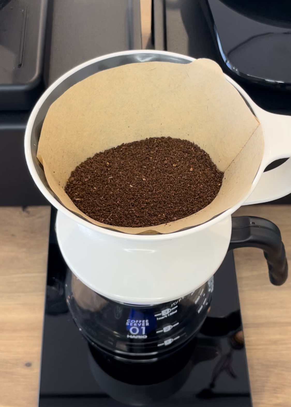 挽き方は普通のドリップと同じ中挽、そしてドリッパーにペーパーを敷いて挽いた豆を入れていきます!